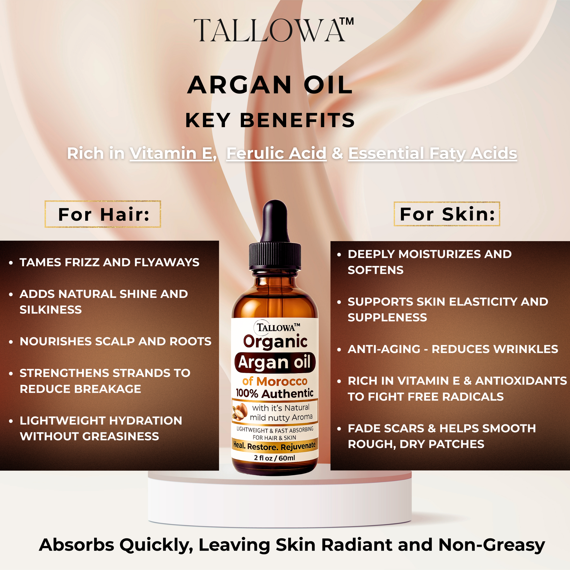 Tallowa™ Argan Oil is handcrafted from the kernels of argan trees that grow exclusively in the sunlit valleys of Morocco. Sourced directly from women’s cooperatives and cold-pressed to preserve every drop of its natural goodness, this golden oil delivers deep nourishment from head to toe.
